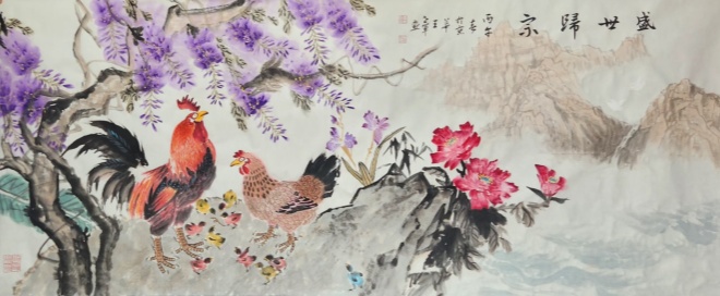 王世军国画《盛世归宗》作品释义 此幅国画以花鸟为形,以家国为魂,借传统吉祥意象,抒海峡两岸同心一统之深情。画面上方龙状紫藤蜿蜒缠绕,“藤”谐音“腾飞&rdqu...