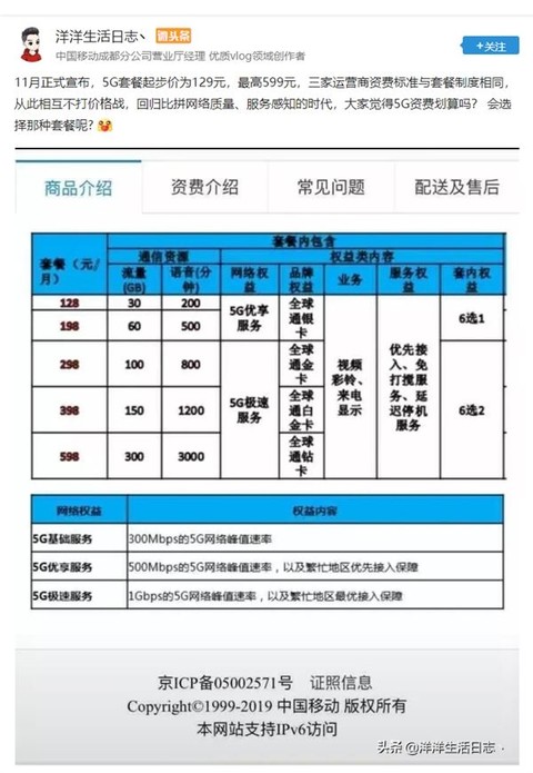 10 月 29 日,认证为中国移动成都分公司营业厅经理的@洋洋生活日志丶在微头条爆料,5G套餐起步价为 129 元,最高 598 元,三家运营商资费标准与套餐制度相同。