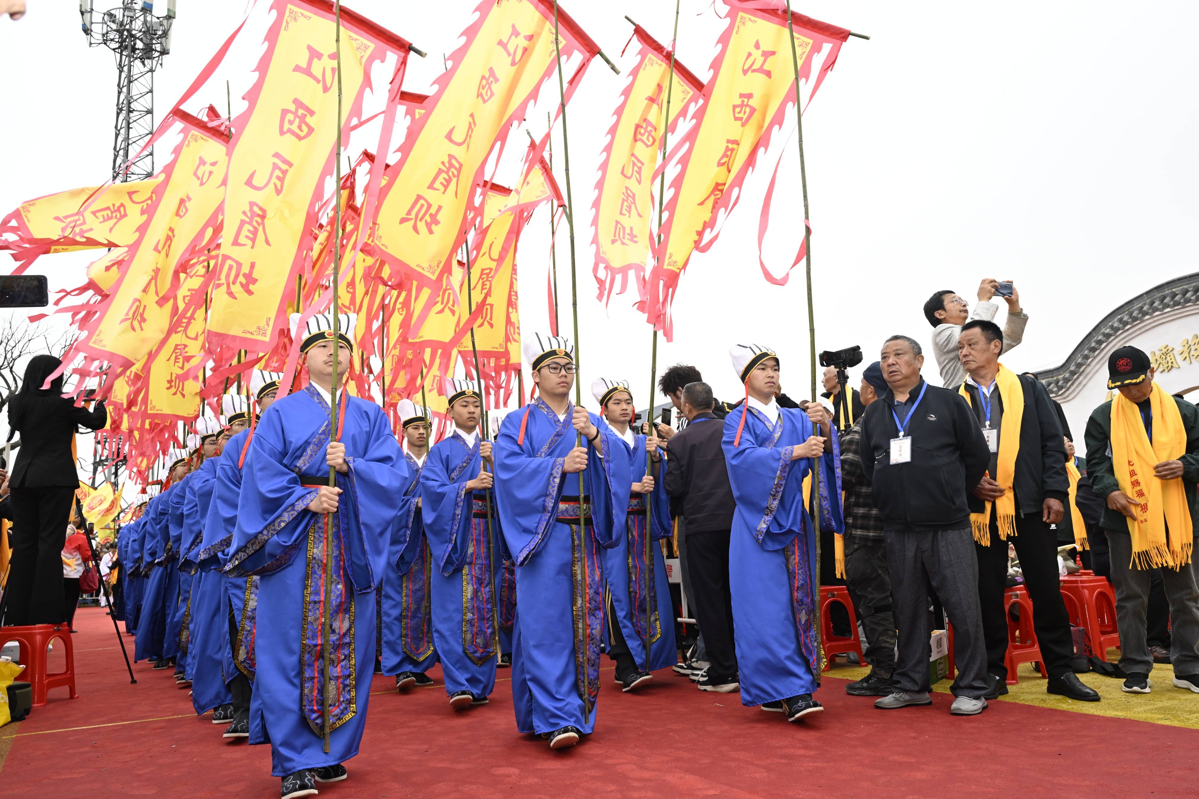 祭祖仪式严格依循古制,庄严肃穆。典礼伊始,八名身着明代服饰的青年,神情恭敬地抬着供奉移民先祖牌位的神轿,缓步步入祭坛,全场肃立。随后,各地移民后裔代表依次净手洁面,虔敬地向先祖敬献香烛、花篮、高香,以及象征五谷丰登的“五谷”与鲜果等祭品。在深沉悠远的祭乐声中,主祭人恭读祭文,追思先民筚路蓝缕、开拓四方的功绩。全体参祭人员面向先祖牌位行三鞠躬礼,场面宏大,气氛凝重,表达了后裔子孙无尽的缅怀与敬意。