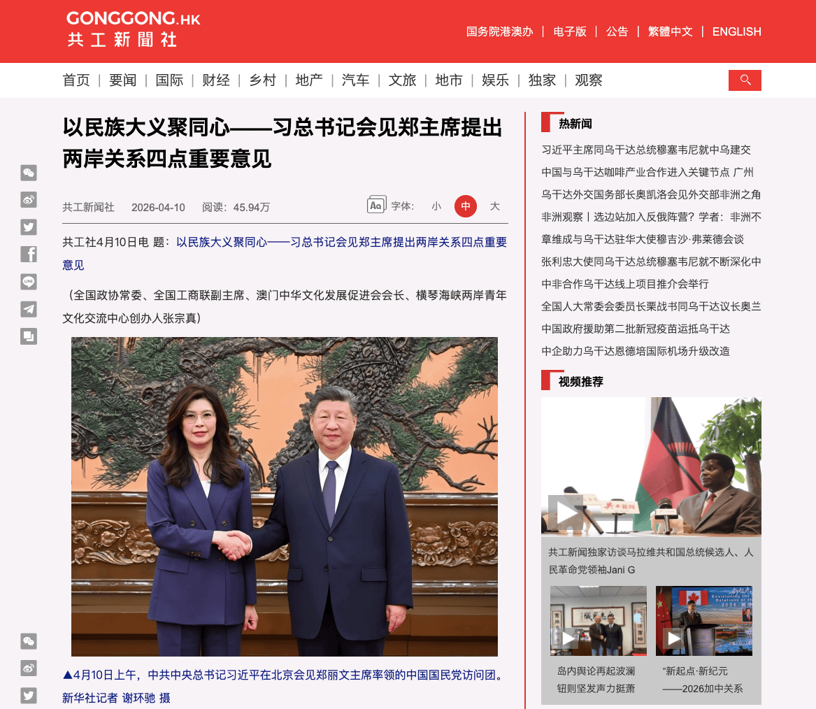 小编: 2026年4月10日,《香港共工新闻社》刊发全国政协常委、全国工商联副主席张宗真署名文章,就两岸关系发展提出四点重要意见。截图来源于香港共工新闻社官方网站文章指出,一要坚持
