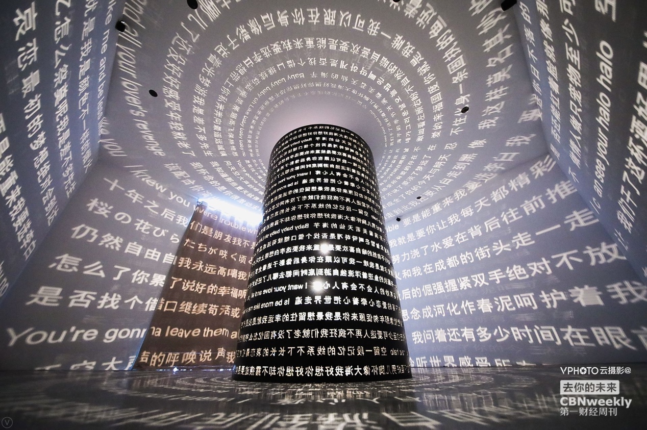 穿过“时光隧道”来到“未来馆”,《第一财经周刊》联合众多品牌,搭建了一个未来商业世界的模样。腾讯音乐娱乐打造了一间360°专属于音乐的房间,全息投影技术将歌词投射到四面墙上,观众触摸墙上的歌词,那段旋律便会响起;