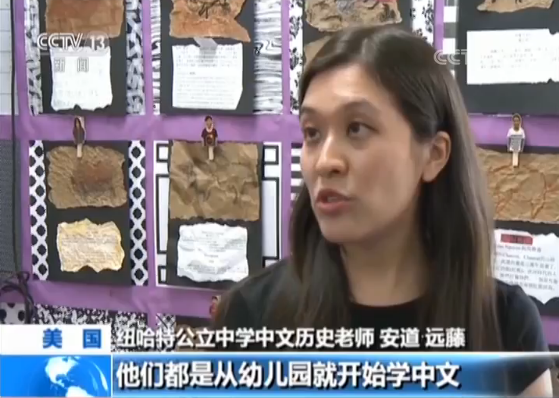 纽哈特公立中学 中文历史老师 安道·远藤:他们都是从幼儿园就开始学中文,他们的中文真的是都蛮好的。他们一般对话、跟老师讲话或跟同学讲话都是说中文的。