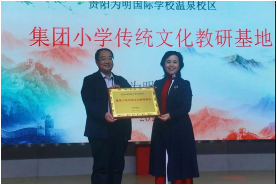 晚会现场,为明学校贵阳学区被授予“集团小学传统文化教研基地”,副总裁张宏玲女士向贵阳学区总校长颁发了奖牌。