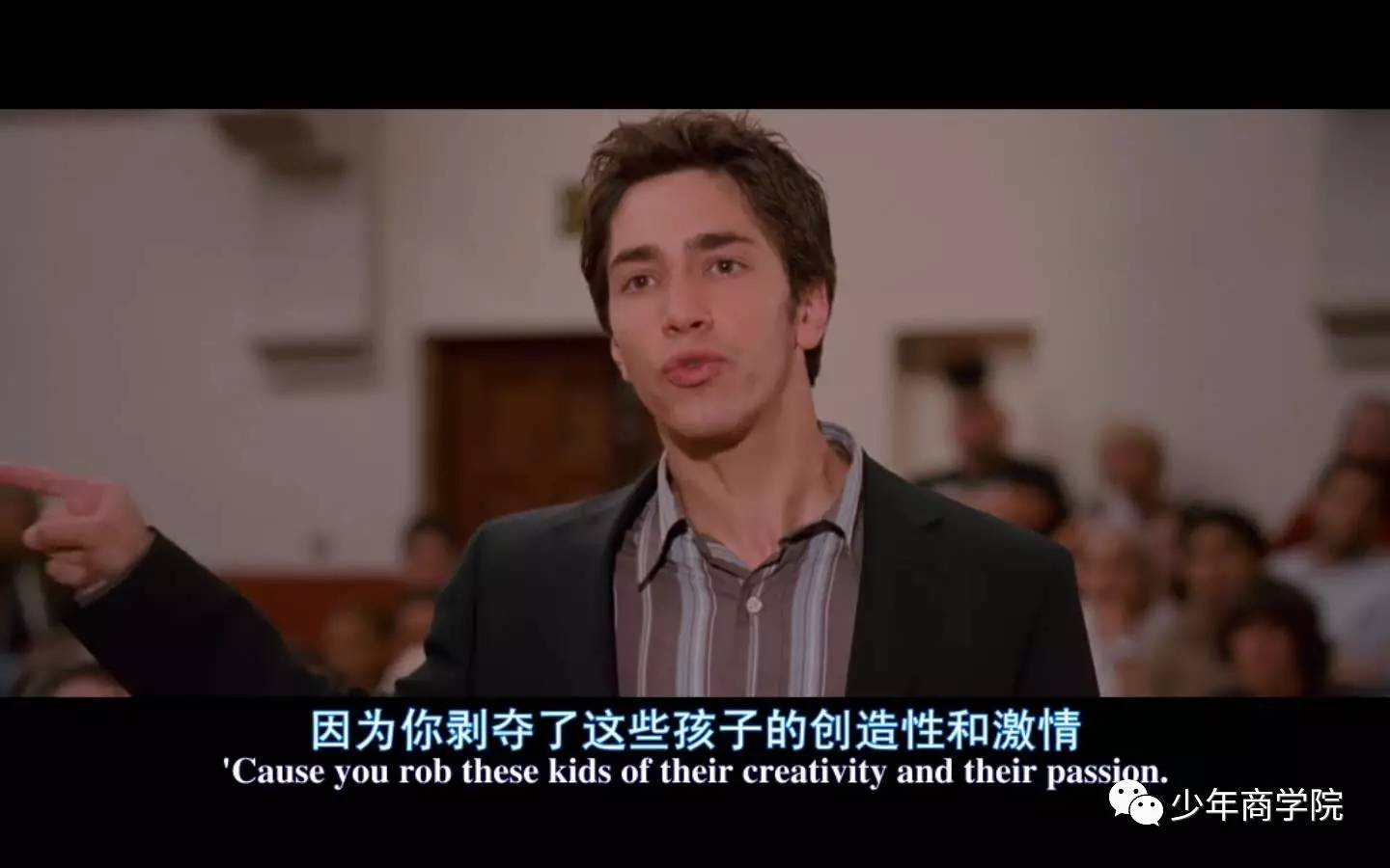 影片进行到这里,我们可以看到男主的巨大成长——他真的找到了自己的热情源泉。而电影的核心思想也呼之欲出:它无意反抗名校,它依然尊重传统,但它也要不客气地指出,有些名校确实因过于恪守传统,压抑个性,而让学生失去了激情和创造力——而这,是一种犯罪。