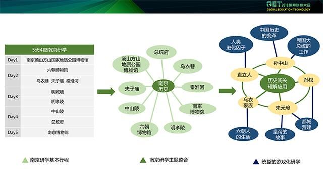 再看看统整课程的逻辑如何具体运用到研学课程的设计。上面第一张表格是常见的行程表,第二张图是南京的景点,把它做成一个地图串联在一起,第三张图是我推崇的也是目前尤里卡采用的方式。在这里特别解释以下第三张图黄色圈层的概念,为什么要围绕南京设计直立人、乌衣豪族、朱元璋等人物?其实是因为我们想通过这场研学,让同学们了解明朝的历史人物是如何影响、推动历史进程的,所以课程设计的中心结构是用人物和事件的关系来搭建。
