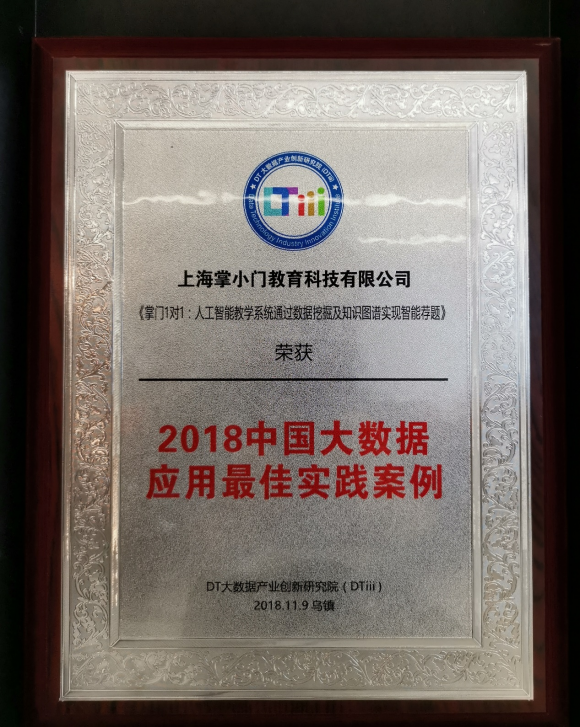 为鼓励互联网创新发展,在大数据与人工智能赋能实体经济产业创新与投资论坛上,主办方评选出了一批对互联网发展做出卓越贡献的优秀企业,并就其智能化成果进行了表彰,《掌门1对1:人工智能教学系统通过数据挖掘及知识图谱实现智能荐题》被评选为“2018中国大数据应用最佳实践案例” 。