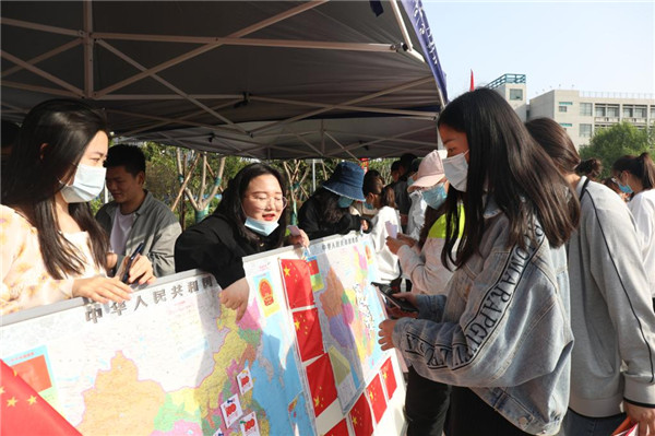 实践活动围绕中国共产党百年发展历史的重要节点设置故事线,在校园中设置12块党史知识展板和12个活动站点。活动分为两部分,一是学习百年党史答题活动,学生手持印有党史知识题目的答题卡,从扬帆广场第一站出发,每到达一个站点,先学习站点设置的党史知识内容,然后进行答题,答对者可获得一枚答题通关印章;二是感悟伟大历程实践活动,各个站点结合不同历史时期组织开展内容丰富、形式多样的学党史实践活动,学生按照活动项目要求完成任务后,可获得一枚活动通关印章。最终,学子们根据获得的通关印章数可以换取相应的礼品。活动现场彩旗飘扬、人影穿梭、气氛热烈,学子们个个热情高涨。
