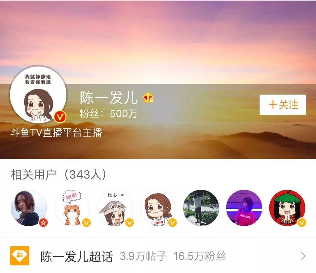 据环环(ID:huanqiu-com)了解,@陈一发儿是斗鱼TV直播平台主播,拥有五百多万微博粉丝。而在斗鱼TV直播平台上,其拥有超过千万的关注者。