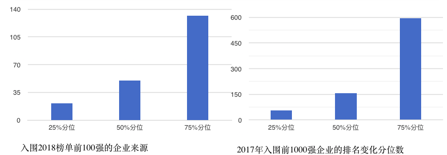 与2017年排名对比,入围2018年前百强企业中,排名变化的25%,50%和75%分位数分别为21,50和132;前千强企业中,排名变化的25%,50%和75%分位数分别为57,158和594。变化幅度适度,越是排名靠前的企业,变化幅度越小,说明本排行榜所依据的算法对优质企业的遴选具有优势。