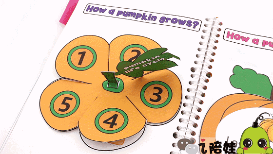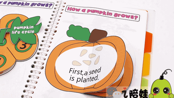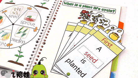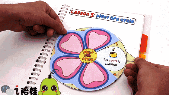 封面是“花期转盘”,转盘的每格,对应1个生长阶段。通过转转盘,可以了解花的5个不同生长阶段的概念,学习5个植物生命循环的核心单词。