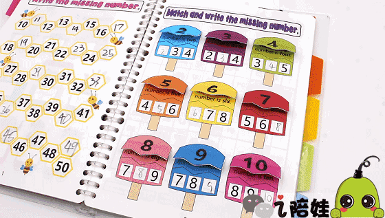 第2页的“五彩棒冰”,是数字1-10之间缺失数字的配对练习。通过棒冰上固定句型The missing number is 6(X),和本组给出数字_,7,8的双重提示,找出缺失数字6配对。