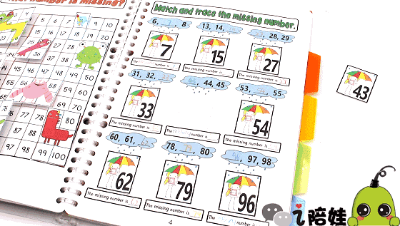 第4页的“下雨啦”,是个1-100之间缺失数字的综合书写配对练习。同是用句型The missing number is X练习,它还要写出每组缺失的数字,并描画单词missing,熟悉missing的写法。