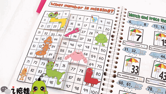 第3页的“拦路小怪兽”,是数字1-100之间缺失数字的书写练习。小怪兽所在的位置,就是缺失的数字。游戏难度也有所增加,缺失的数字涉及到2~3个数字。