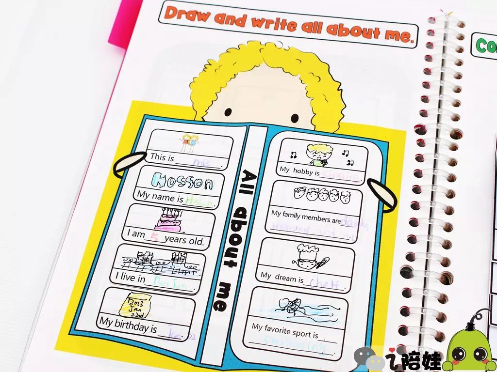 第3页的“认识我小书”,是个写画练习,它把核心单词汇总到一起,通过写画的方式,学会向别人介绍自己的信息。