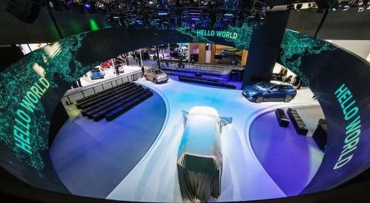 比如威马汽车就是由 360 度环形双层屏幕构筑的智能交互展台,自外而内构建出专属于智能科技的独特魅力。基于一系列语音、声光交互的外侧屏幕像一位最懂得智能化时代需求的朋友,欢迎着所有用户的到来。
