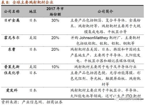 随着磁控溅射技术发展,高纯溅射靶材成为制备薄膜材料的关键原料之一,主要应用于平板显示、记录媒体、电子器件半导体、太阳能、镀膜玻璃等;当前溅射靶材市场正处于高速成长的进程中,2016年全球溅射靶材市场规模约为113.6亿美元,其中平板显示(含触控屏)用靶材为38.1亿美元、半导体用靶材11.9亿美元、太阳能电池用靶材23.4亿美元、记录媒体靶材33.5亿美元。WSTS数据显示,2016年全球溅射靶材市场需求达113.6亿美元,并预计2016-2019复合增速达13%,2019年将超过163亿美元。2016全球靶材下游结构中,半导体占10%、平板显示占34%、太阳能电池占21%、记录媒体占29%,这三大应用对靶材性能要求依次降低,是靶材需求增长的主要驱动力。溅射靶材技术及投资比例较高,靶材的纯度、组织、晶粒尺寸等明显制约镀膜质量。目前具有规模化生产能力较少,霍尼韦尔、日矿金属、东曹、普莱克斯等龙头企业2017年全球市场份额大约占80%。美、日等跨国企业产业链较为完整,囊括金属提纯、靶材制造、溅射镀膜和终端应用各个环节,主导高端的半导体靶材市场,在掌握先进技术以后实施垄断和封锁,主导着技术革新和产业发展;韩国、新加坡及中国台湾地区擅长磁记录及光学薄膜领域,但厂商普遍缺少核心技术及装备,溅射靶材的材料即靶坯依然依赖美国和日本的进口;中国靶材产业正处于起步阶段,逐步切入全球主流半导体、显示、光伏等龙头企业客户,原料以进口为主。