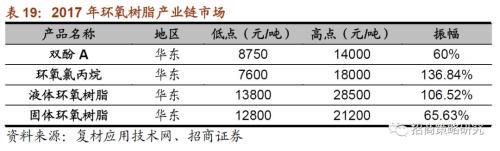 碳纤维产业链包括上游原丝生产、中游碳化环节、下游复合材料及其应用,环氧树脂作为复合材料可以使碳纤维质量比金属铝轻,但强度却高于钢铁,并且具有耐高温、耐腐蚀、耐疲劳、抗蠕变等特性。环氧树脂具有优良的物理机械和电绝缘性能,附着力强,能将碳纤维粘接在一起。碳纤维按照力学性能可分为高强型、超高强型、高模量型和超高模量型。采用日本东丽公司的产品代号,T指横截面面积为1平方厘米单位数量的该类碳纤维可承受的拉力吨数。目前,我国已能生产T800等较高端的碳纤维,但日本东丽早在上世纪90年代就已经掌握这一技术。环氧树脂的耐候性与玻璃化转变温度有直接关系,复合材料在航空领域应用时,普遍要求环氧树脂玻璃化转变温度不能低于180℃,而目前国产树脂领域绝大多数企业还不具备相关技术。2000年以来,随着国民经济快速,稳健发展,环氧树脂行业也得到了长足进步。中国环氧树脂业生产量由2000年的6万吨增加到2005年的30万吨以上;消费量由2000年的18万吨增加到2005年的65万吨,年均普遍增加率达30%。2017年环氧树脂产业链上各产品景气度明显上升。双酚A市场亦创下3年来新高,达到2014年7月份中旬水平。液体树脂更是达到了2009年以来的新高。环氧氯丙烷、固体环氧树脂达到了2012年以来7年的新高。其中环氧氯丙烷更是表现亮眼,年内振幅高达136.84%。