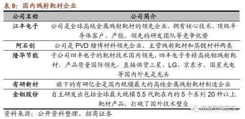 近年来,国内开始出现少量专业从事高纯溅射靶材研发和生产的企业,突破靶材专业技术门槛,已在国内靶材市场占据一定份额,主要有江丰电子、阿石创、有研新材和隆华节能等,成功开发出一批能适应高端应用领域的溅射靶材,成功切入全球半导体龙头的供应链,改变了高纯溅射靶材长期依赖进口的不利局面。例如,苹果A10芯片的制造用的正是江丰电子高纯度溅射靶材。