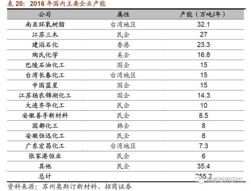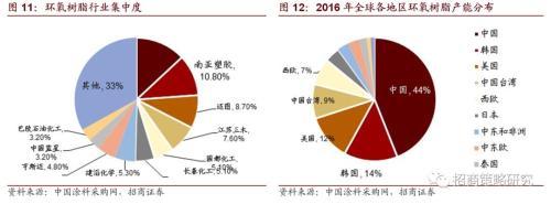 中国环氧树脂产能占全球高过45%,包括外企在中国的生产工厂如陶氏化学,韩国国都,台湾长春,台湾南亚塑胶,宏昌化工,香港建滔化学;也有本土优秀企业如三木化工,扬农化工,巴陵石化等。2000年我国环氧树脂产能达到为16万吨,产量为10万吨。2007 年年产能达到100万吨。2016年产能进一步增至255万吨。预计未来中国环氧树脂产能还将进一步增长。未来5-10年,中国环氧树脂行业将会进一步规范化,生产成本过高、环保不合格、产品档次低的企业将被淘汰。同时,国内支柱产业加快发展给环氧树脂行业带来无限商机,如汽车领域,信息产业,能源、交通运输、建筑产业,这些发展方兴未艾的支柱产业都是应用环氧树脂的生力领域,会对环氧树脂带来巨大的市场需求。此外,2018年4月商务部出台对美加征关税商品清单中也有环氧树脂,这将大大有益于国内环氧树脂企业的发展。中国环氧树脂制造商众多,但万吨级规模以上的企业为数不多。中国环氧树脂主要研发生产企业有广州宏昌电子材料工业有限公司,巴陵石化岳阳石油化工总厂,蓝星星辰新材料有限公司,广东汽巴高分子化工有限公司,江苏三木集团公司,大连齐化化工有限责任公司,无锡迪爱生环氧有限公司等。