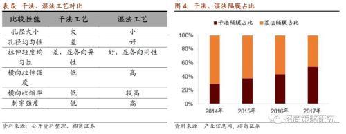 制备锂电池隔膜有干法和湿法两种工艺,干法隔膜和湿法隔膜各有优缺点,干法隔膜在生产工艺、成本、环保经济等方面具有较大优势,湿法隔膜则具有短路率低、孔隙率和透气性可控范围大等优点。目前市场的应用中,从全球锂电池企业的选择来看,干法隔膜和湿法隔膜并存,但近年来随着三元锂电池占比的提高,湿法隔膜产量的占比也稳步提升。2017年国内湿法隔膜产量达到8.06亿平方米,占比56%,超过干法隔膜。目前,全球最好的锂电池隔膜材料出自旭化成和东燃化学两家日本公司,国内锂电池铝塑膜市场90%以上的份额被昭和电工等日本厂商垄断。与日本生产的锂电池隔膜相比,我国的高端隔膜差距明显。国产隔膜产品存在一致性不高、孔隙率不达标等问题,厚度、孔隙分布以及孔径分布不均。目前我国在锂电池隔膜的干法工艺方面已迈入了世界第一方阵,但在湿法隔膜领域,国内企业虽掌握方法,但整体仍难以与外国巨头抗衡,核心生产设备主要依赖进口。