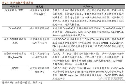 数据库管理系统:目前全世界最流行的两种DBMS是甲骨文公司旗下的Oracle和MySQL,中国数据库厂商大多基于开源数据库引擎开发或基于成熟数据库源码进行自主研发。总体看,国产数据库产品已经取得了明显进展。相关上市公司:东软集团等。