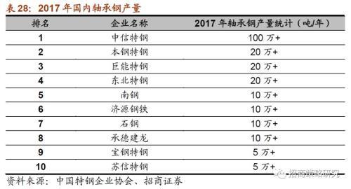 国内特钢行业中,太原钢铁(集团)有限公司、中信泰富特钢集团、东北特钢集团、宝钢特钢有限公司、西宁特殊钢股份有限公司、宝钢不锈六家国有特钢企业,是特钢行业的优势企业,在行业中占有引领地位。六家企业产能总计达2800万吨钢,其中不锈钢达600万吨,轴承钢200万吨,合金工模具钢80万吨,合金结构钢800万吨,棒材1600万吨,线万吨.六家特钢企业生产已在数量上与国民经济发展大体适应。民营企业方面,天工国际有限公司、久立集团股份有限公司、永兴特种不锈钢股份有限公司,三家民营特钢企业的专业化、制品化特色突出,能对特钢行业转型升级提供借鉴经验。2017年国内轴承钢品种产量总计达到300万吨以上,国内各钢厂在轴承钢品种方面产量差距也相对较大,前三名的中信特钢、东北特钢、巨能特钢的产量之和占国内总产量近60%的份额。国内高端轴承钢技术近日也取得了最新的突破。2018年7月,西王特钢首批高端稀土轴承钢顺利生产下线,技术性能达到了国际先进水平,产品品质超过了美国、欧洲相关标准,解决高端轴承钢技术“卡脖子”难题指日可待。