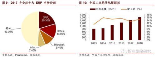 目前处于群雄割据的状态。ERP行业市场、技术壁垒较高,呈现出寡头市场的特征,少数几个领导厂商占据绝大部分市场份额,拥有市场定价权并分享主要利润。SAP、Oracle 等国外厂商一直占据主导地位。本土厂商在国内软件市场有得天独厚的优势,在经历了导入、成长和普及的长期发展过程以后,中国 ERP 企业的发展进入了新阶段,同时用友、金蝶等厂商坚定发展云计算业务,使得本土厂商孕育出弯道超车的可能。截至 2017 年上半年,金蝶云服务收入的占比近 27%,公司在云服务上积累的先发优势有助于其充分享受行业云化带来的红利。总体来讲,国内自主工业软件发展现状可以概括为“管理软件强、工程软件弱;低端软件多,高端软件少”。但是我国工业软件市场规模的逐年增长,这一现状正在改变。2017年中国工业软件行业市场规模达到1412.4亿元。在中国制造2025的大背景下,工业企业转变发展模式、加快两化融合成为大势所趋,工业软件以及信息化服务的需求仍将继续增加,预计2018年中国工业软件市场规模将达到1622.8亿元。
