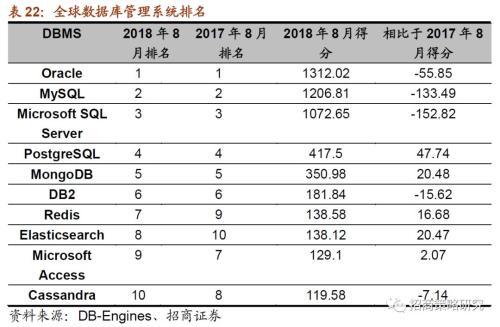 数据库管理系统其功能和常见的图书管理系统没什么差别,挑战在于当数据量达到TB或PB级别时,关系型数据库管理系统(RDBMS)的性能将会下降。目前全世界最流行的两种DBMS是甲骨文公司旗下的Oracle和MySQL,其他竞争者还有IBM公司的DB2、Informix,微软公司的SQLserver以及开源的MariaDB等等。目前,甲骨文、IBM、微软和Teradata几家美国公司占据了大部分市场份额。国内DBMS企业最早源自1990年代的高校,但经过多年的研发,产品的稳定性一直不足,不敢做有挑战性的性能测试,无法让市场信服,国内企业更加不敢“委以重任”。DBMS国货的市场份额非常少,而且银行、电信、电力等要求极端稳妥的企业,不会考虑国货,一线技术人员对国产化替代积极性不高。况且,传统的数据库管理系统具有先发优势、完善的售后技术支持,系统迁移需要支付高额的迁移成本,因此企业难以迁移到新系统。DB-Engines排名在业界引用较多,权威性很高,相对客观。DB-Engines通过6个方面的统计数据综合评估各个数据库产品得分并给出综合排名:1) 数据库相关网站数量;2) 公众关注度;3) 技术讨论活跃度;4) 招聘职位;5) 专业档案;6) 社交网络信息。根据DB最新公布的排名,Oracle、MySQL、Microsoft SQL Server依旧保持前几名的位置,但是其市占率相比于2017年有所下降。