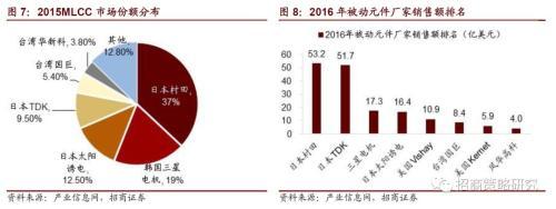 中国有庞大的基础电子元件市场,每年可消耗数万亿的电阻和电容。目前中国大部分市场份额被日本占据,台其次为湾,中国大陆只能占据中低端市场。当前,MLCC市场前五大厂商分别是村田、三星电机、国巨、太阳诱电和TDK,合计占据85%的市场份额。在被动元件领域日本公司是绝对的霸主,日本公司的产业动向可以左右和决定行业的走向,其他公司包括台湾华新科、齐力新、立隆电子、禾伸堂,中国大陆江海股份、顺络电子、法拉电子、宇阳科技艾华集团等。