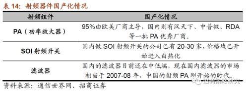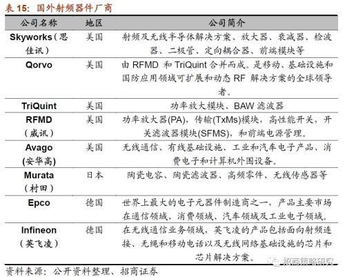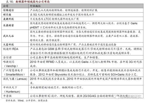 2018年射频芯片市场可达150亿美元,而高端市场基本被Skyworks、Qorvo和博通3家垄断,高通也占一席之地。国货只能卖给一些小品牌手机,且多为2G、3G芯片,4G射频芯片基本依赖进口。手机上的射频芯片占整个线%。目前手机中所有核心器件都完成了国产化,只有射频器件仍然95%由欧美厂商主导,尚未有亚洲厂商可以进入市场。但是国内在军工等方面的射频本身已经存在一些积累,近几年国内射频的公司也取得了很大的突破。一些有历史背景的公司如德清华莹、好达等产品在手机品牌客户加速认证,一些有海外经历的创业公司如 Vanchip、卓胜微、瑞宏和瑞石等也取得了非常快速的成长。未来几年在switch、saw filter、PA 和上游晶体材料上面将持续推进国产化替代,相应的A股上市公司信维通信、天通股份和三安光电等标的将持续受益。5G通信的到来为射频前端带来诸多挑战,包括更多射频通路下的布局空间挑战、更多射频通路下的成本挑战、更高功率输出、更高工作频段对射频器件性能的挑战。目前在射频前端的各个市场中, SAW 滤波器的供应商主要是美国和日本厂商,包括 Qorvo、博通(收购 Avago)、Skyworks、Murata、TDK 和太阳诱电。其中 Murata 占据 SAW 滤波器的 50%的市场,其次则是 TDK。 BAW 滤波器市场基本由 Qorvo 和 Avago 垄断。中国厂家由于在专利和工艺方面尚未成熟,目前只在低端的 SAW滤波器市场上可以量产,供应商有麦捷科技、中电德清华莹、华远微电、无锡好达电子,其中只有无锡好达和华远微电打入了手机市场。国内厂商的滤波器还不能做进集成模块,只能做成低端外挂的分立器件,滤波器是中国厂商进军手机射频前端的最大门槛。
