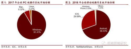 PC操作系统市场同样是以微软、苹果等美国公司为主的寡头垄断市场。自从1985年微软发布第一代操作系统Windows 1.0,微软的Windows操作系统一直占据PC操作系统市场龙头位置长达三十余年,2017年Windows操作系统的市场占有率高达91.41%。其他PC操作系统包括Linux、Unix、ChromeOS等市场份额较小。Linux操作系统的内核源代码可以自由传播,当前主要用于服务器,2017年市占率为2.27%;Unix操作系统大多是在多处理器架构下运行,常用于学校的工作站。国产操作系统深度、普华、中标麒麟、红旗等都是在Linux的基础上二次开发出来的操作系统。