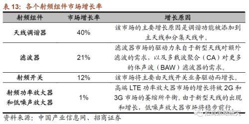 射频(RF)指的是频率范围从 300KHz~300GHz 之间的电磁波。射频器件在无线通信领域中被广泛使用,起到在发射和接收的过程中将二进制数字信号与高频率的无线电磁波信号转换的作用。射频器件市场主要分为两个方向:一个是以基站为代表的通信基础设施建设市场,功率和散热要求高,频谱效率要求高,集成度要求一般。另一个是移动终端市场,生命周期较短(1-2 年),周期性较基站射频市场弱,但规模更大。终端射频主要器件由功率放大器(PAs)、低噪声放大器(LNAs)、开关、双工器、滤波器和其他被动设备组成。智能手机的功能日益全面,组件越来越复杂,剩余空间越来越小,对射频前端组件的集成度要求也就越来越高,因此模块化的射频前端将成为趋势,其价值将超过分立射频器件价值的总和。未来 5G 终端,集成的射频前端 RF 套片的价格甚至将超过主芯片,成为手机主板中最贵的器件。同时,5G的到来对射频芯片功耗和小型化提出了更高的要求,高频通信的射频是全球面临的普遍性难题。全球领先的射频相关企业已经展开了5G高频通信所需的射频芯片研发。博通在2016年推出了主要针对60GHz频段WiFi标准(802.11.ad)的毫米波收发机芯片BCM20138,并积极推出满足移动网络需求的高频射频器件。