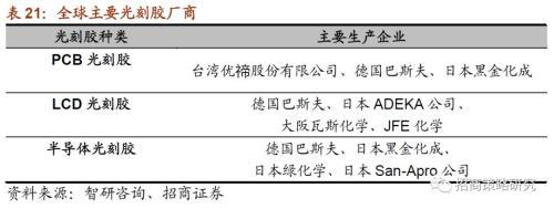 光刻胶:应用范围主要有PCB /LCD/LED和半导体,前三种要求相对较低,但仍未完全自给。半导体光刻胶壁垒较高,几乎被日美垄断。国内产品落后4代,但少数企业在中高端领域已取得一定突破。相关上市公司:强力新材、容大感光、晶瑞股份等。
