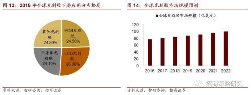 自2002年起,我国逐渐从 PCB 光刻胶进口大国转变为PCB 出口大国。2015年我国PCB光刻胶产值达12.6亿美元,占全球市场份额高达70%。在PCB领域,干膜已被外资把控,油墨部分已有国产替代,进口替代率达到46%,容大感光、广信材料等公司是主要参与者。LCD光刻胶: