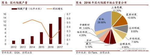 目前,锂电池四大核心材料中,正、负极材料、电解液都已实现了国产化,而隔膜仍是短板,国产化率较低,隔膜是锂电池原材料中技术壁垒最高的部分。国内锂电池企业众多,未来进入国际市场,面对国际巨头竞争,缺乏核心专利和材料技术是中国电池企业未来最大的隐忧和短板。国产隔膜主要供应低端3C类电池市场,而高端隔膜仍然依然大量依赖进口。干法隔膜技术比较成熟,国产干法隔膜基本能够完全替代进口产品,而在湿法隔膜领域国内还处于进口替代的前期。同时,国内对隔膜需求量增长速度较快,也会带动国内企业技术进步及产能扩张。2017年,我国隔膜产量14.4亿平方米,同比增长33%,自2012年到2017年,国内隔膜产量年复合增长率达到68%。总体来看,我国锂电池隔膜行业企业集中度较高,2017年我国湿法隔膜前三企业出货量占比达到71%,前五占比达到87%;干法隔膜前三企业占比为42%,前五占比为55%。目前,我国锂电池隔膜材料企业集中分布在华东和华中地区,产能比重分别达到48%、27%;华南地区产能占比也有10%,其他地区则都在10%以下。随着锂电池隔膜市场的快速发展,国内企业也正在加速产能扩张。截止到2017年底,国内确认投产的锂电池隔膜产能约为29亿平方米。产能较大的企业湖南中锂、上海恩捷、星源材质、中兴新材、天津东皋、苏州捷力、河南义腾等产能均在2亿平方米以上,合计产能为19.28亿平方米,占比全市场超过67%。