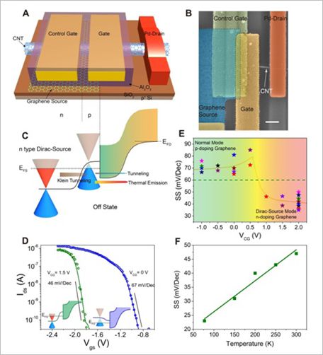 采用双栅控制实现的狄拉克源晶体管结构和性能表征,其中半导体碳纳米管作为器件的有源沟道,源端采用一个控制栅来调节石墨烯的费米能级