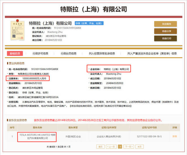 据国家企业信用信息公示系统显示,特斯拉已于5月10日在上海出资设立了全资子公司——特斯拉(上海)有限公司。这也引发了外界不少人对于特斯拉中国建厂的再一次的猜测,有人说,此次特斯拉成立上海公司是为了未来特斯拉国产铺路,甚至更有媒体指出,特斯拉上海公司的成立意味着特斯拉将以独资国产的形式进入中国市场。