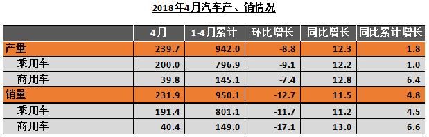 中国汽车工业协会发布了4月份中国汽车产销报告,显示在刚刚过去的4月,中国汽车产销分别完成了239.74万辆和231.86万辆,相较于去年同期,分别上涨12.27%和11.47%,增幅明显。但与3月份相比,产、销量则均有所下降,降幅分别为8.79%和12.71%。