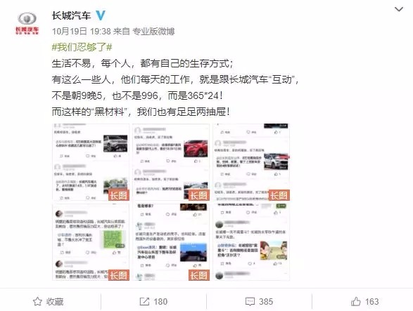 然而,就在涉案截屏信息的影响已经被消除后,2018年10月18日,长城汽车在其以分公司长城汽车股份有限公司徐水哈弗销售分公司名义注册的新浪微博上发布声明,称“吉利汽车虽对此事进行了官方声明,但某品牌拥有海量水军是不争的事实,专门抹黑所有民族自主品牌、粉饰自己、表里不一。”并将涉案截屏信息在其微博上再次发布。