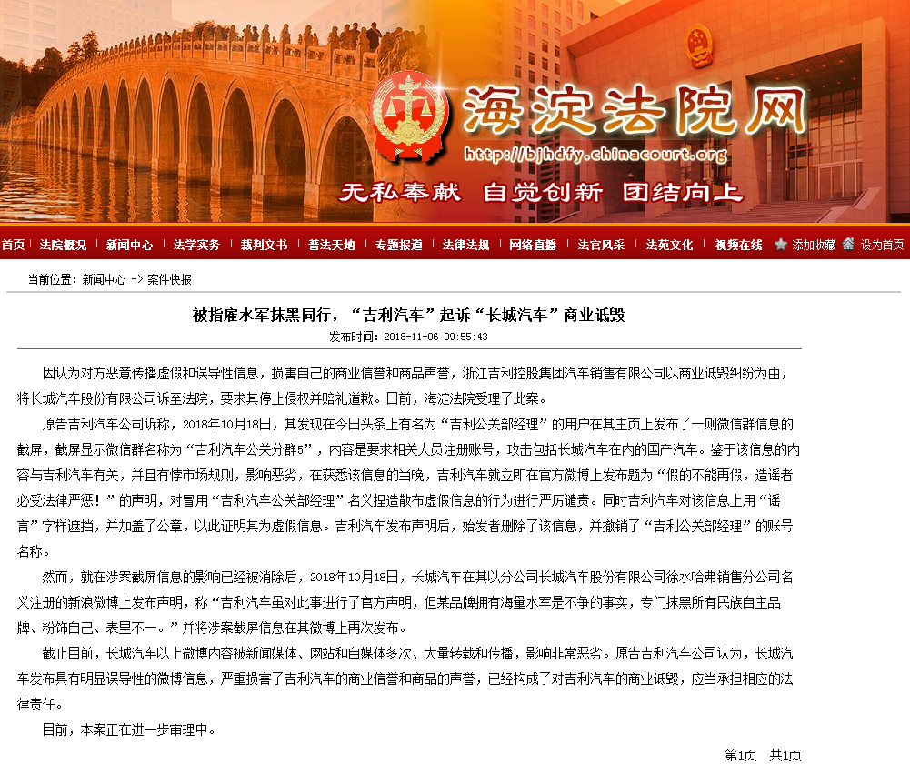 惊爆!浙江吉利汽车“正式起诉”长城汽车!北京海淀区法院已经正式受理此案,如上图所示。如上图所示,据海淀区法院官网披露:因认为对方恶意传播虚假和误导性信息,损害自己的商业信誉和商品声誉,浙江吉利集团以商