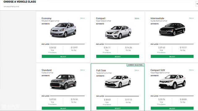 随后,一般根据随行人数而确定需要的车型。Full size(中型轿车)的车型最为经济实惠(通常是凯美瑞、天籁、雅阁等)。值得注意的是,若异地还车是需要缴纳很高服务费的。