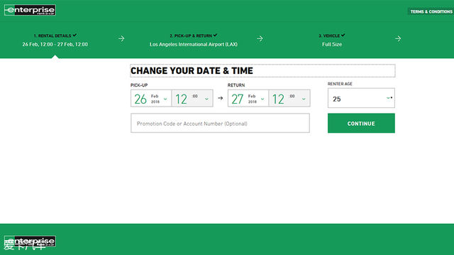 比较后选择一家最合适的公司进入其官网进行预约(Reservation),通常来说,品牌公司官网的价格会比黄页网站上便宜。以Enterprise公司为例,首先确定租赁时限,天数越多价格会越低。