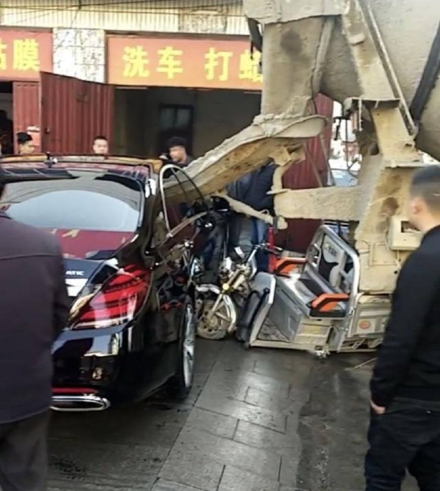 可能是因为搅拌车在倒车的时候存在着一定的盲区,在倒车的过程中也没有看到后面撞到三轮车,然后继续倒车把三轮车把奔驰车撞凹进去之后才发现,但此时为时已晚。像这种混泥土搅拌车重达几十吨,它倒车产生的动力是非常强的,而且电动三轮车也被挤得接近报废,奔驰S级轿车虽然豪华,并且安全性高,但是遇到这种重量级的车,是完全没有任何招架之力,毕竟没有任何一辆轿车遇到这种水泥搅拌车的碰撞还能安然无恙。