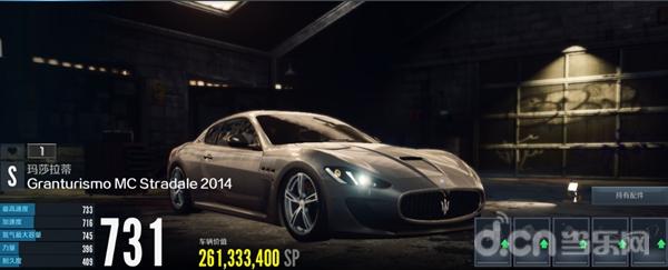 回到游戏中,先来看数据:最高速度733点,加速度716点,氮气容量745点,力量396点,耐久400点,总评731点。极速295km/s。