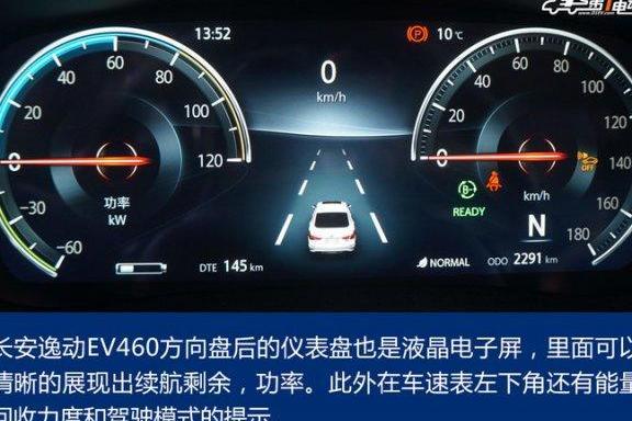 笔者今天驾驶的高配版长安逸动 EV460 还是非常值得称赞的,10 英寸的大屏幕显示非常清晰,且具有 6 组功能显示,基本该有的都有了。方向盘后的仪表盘也是液晶电子屏,里面可以清晰的展现出续航剩余,功率等。
