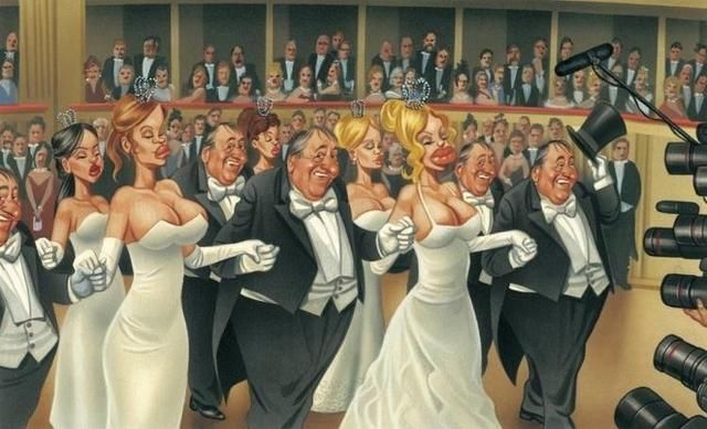 这幅插画真实地展示了上流社会是如何的无聊和同质。所有男人看起来完全一样:丑陋和肥胖。所有的女性则看起来像是经历了流水线整形手术。所谓的上流社会或许并没有我们在电视中看到的那么优雅和令人向往,真实的世界里,这要更加的丑恶得多。