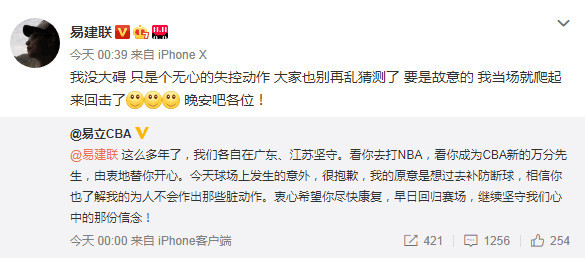 易立的这一动作迅速在网上引发球迷的热议,一些人认为他是故意伸脚拌蒜易建联,赛后易立通过个人社媒进行致歉:“@易建联 这么多年了,我们各自在广东、江苏坚守。看你去打NBA,看你成为CBA新的万分先生,由衷地替你开心。今天球场上发生的意外,很抱歉,我的原意是想过去补防断球,相信你也了解我的为人不会作出那些脏动作。衷心希望你尽快康复,早日回归赛场,继续坚守我们心中的那份信念!”