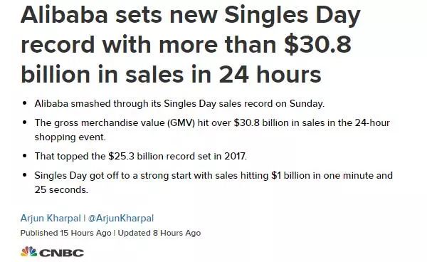 “11月11日是一切购物纪录被打破的日子。”美国互联网媒体CNET网站以“2018年黑色星期五与中国光棍节相比微不足道”为题称,“黑色星期五”和“网络星期一”是伟大的发明,因为我们可以以更低价格疯狂购物。但你知道什么更胜一筹吗?那就是中国的“双11”购物狂潮。文章称,中国“双11”比美国“黑色星期五”和“网络星期一”的销售总和大得多,今年有18万个中国和国际品牌参加第10次“双11”购物狂欢。美国《时代》周刊网站称,去年“双11”阿里巴巴的销售额为253亿美元,相比之下,美国“黑色星期五”和“网络星期一”的总在线亿美元,而且阿里巴巴并不是唯一的玩家。