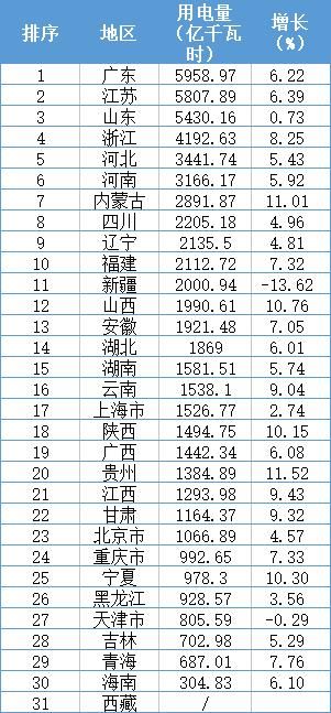 价值线研究员从能源局官网未找到各省前三季度的详细数据,则整理了2017年各省的用电数据如下: