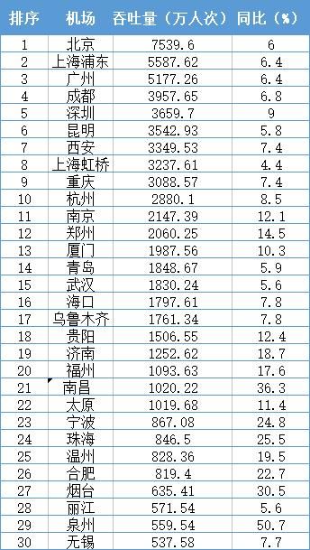 今年前三季度,北京首都机场以7539.6万人次再度蝉联中国大陆机场吞吐量排行榜首位。值得注意的是,不少体量较小的机场客流量增速惊人,泉州、南昌、烟台三地机场客流量增速分别达到50.7%、30.3%、30.5%位居增幅前三名。